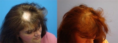 Genny was treated for invasive lymphoma of the scalp with surgery followed by 22 bouts of radiation treatment. When Dr. Boden met her, referred by her radiation oncologist, she was three years post treatment, and had a large bald spot visible on the frontal area of her scalp. Before (L) and 5 Months After Hair…